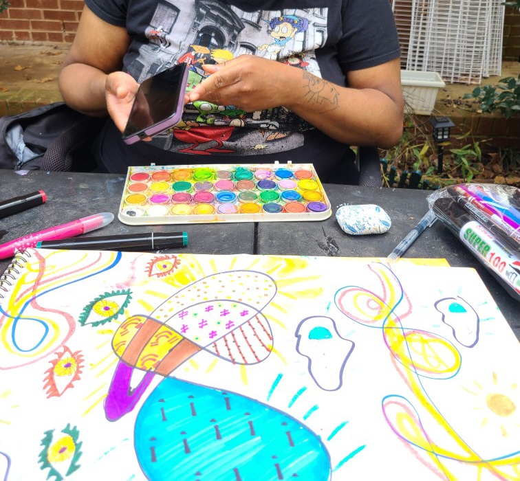 It doesn’t matter who. Just find someone you can hang out with and one of the things you guys do is make art together. Judgement free. There doesn’t even need to be a concept. Just a huge piece of paper and a couple of mediums. It helps with idea flow and your mood.